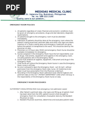 MCN Healthcares Emergency Department Policy and Procedure Manual addresses all areas of Emergency Department patient management with over 280 ready-to-customize policies and procedures. For assistance in implementing emergency procedures in your buildingarea please contact Safety Health and Wellbeing on 61 8 6488 3938.