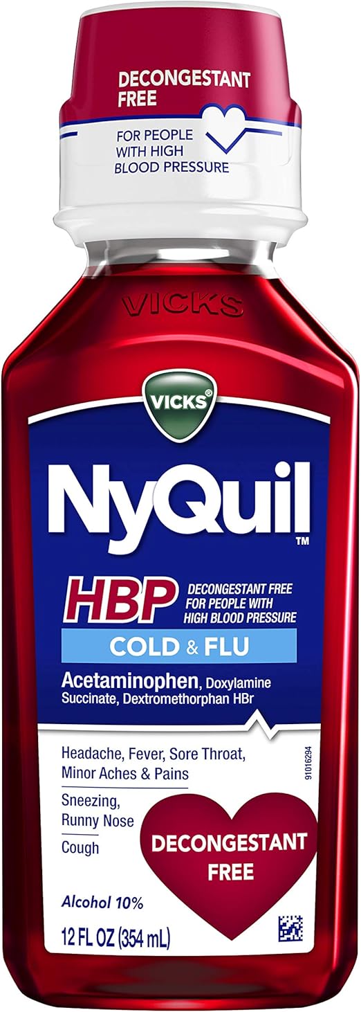 Amazon Com Vicks Nyquil Cough Cold Flu Relief For High Blood Pressure Sore Throat Fever And Cough Relief Decongestant Free 12 Fl Oz Health Personal Care